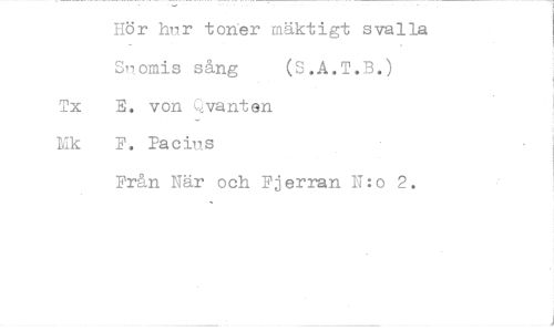 //// Hör hur toner mäktigt svalla Snomis sång ( .A.T.B.) //// Tx E. von Qvanten //// lik F. Pacius //// Från När och Fjerran N:o 2. ////