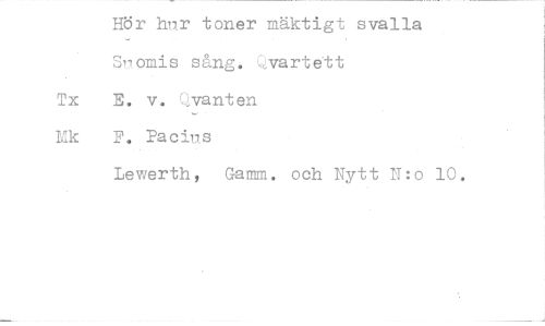 //// Hör hur toner mäktigt svalla Suomis sång. Qvartett //// Tx E. v. ?vanten //// Mk P. Pacius //// Lewerth, Gam. och Nytt N:o 10. ////