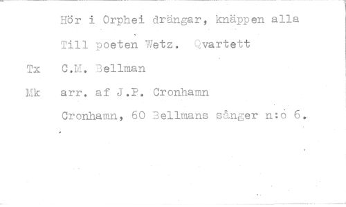 //// Hör i Orphei drängar, knäppen alla Till poeten Wetz. Qvartett //// Tx C.M. Belltan //// Mk arr. af J.P. Cronhamn //// Cronhamn, 60 Bellmans sånger n:6 6.. ////