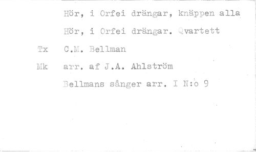 //// Hör, i Orfei drängar, knäppen alla Hör, i Orfei drängar. vartett //// Tx C.M. Bellman //// Mk arr. af J.A. Åhlström //// Bellmans sånger arr. I N:o 9 ////