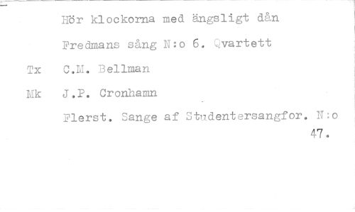 //// Hör klockorna med ängsligt dån Fredmans sång N:o 6. Qvartett //// Tx C.M. Bellman //// Mk J.P. Cronhamn //// Plerst. Sange af Studentersangfor. N:o //// 47, ////