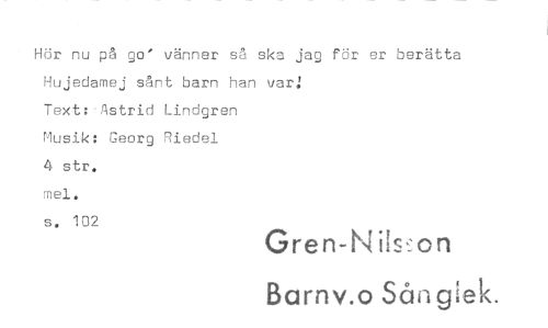 //// Hör nu på go' vänner så ska jag för er berätta Hujedamej sånt barn han var: //// Text: Astrid Lindgren //// Musik: Georg Riedel //// 4 str. mel. //// s. 102 //// Gren-N ils,:on //// Barnv.o Sång ek. ////