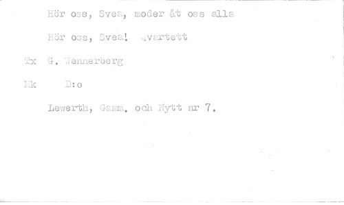 //// Hör oss, Svea, moder åt oss alla Hör oss, Sveat „4varte-bt //// Tx G. 'iennerberg //// 1:1k D:o //// Lewerth, Garn. och Nytt nr 7. ////