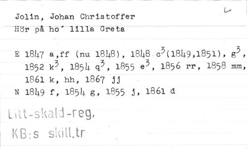 //// Jolin, Johan Christoffer Hör på ho' lilla Greta //// E 1847 a,ff (nu 1848), 1848 03(1849,1851), g3, 1852 k3, 1854 q3, 1855 e3, 1856 rr, 1858 mm, 1861 k, hh, 1867 jj //// N 1849 f, 1854 g, 1855 j, 1861 d //// ,t-skat i -Feg, //// KB:s s utt.tr ////