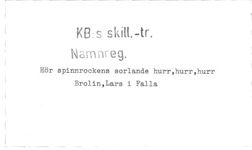 //// KO: s skitt.-tr. //// Namnveg. //// Hör spinnrockens sorlande hurr,hurr,hurr Brolin,Lars i Falla ////