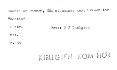 //// Hösten är kommen, Hör stomarnas gny. Svanen tar "Hösten" //// 2 str. Text: C P Dahlgren //// mel. //// S. 55 //// KELGREN KOM HOR ////