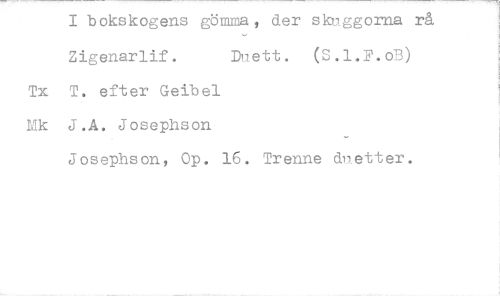 //// I bokskogens gömma, der skuggorna rå Zigenarlif. Duett. (S.1.F.oB) //// Tx T. efter Geibel //// Mk J.A. Josephson //// Josephson, Op. 16. Trenne duetter. ////
