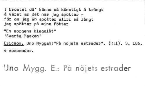 //// I bröstet dä' känns så könstigt å trångt å värst är det når jag spötter - //// för om jag än spötter allri så långt jag spötter på mina fötter //// "En sorgens klagolåt" 'Svarta Masken' //// Ericsons Uno Myggan:"På nöjets estrader". (R:1). S. 186. 4 versrader. //// lno Mygg. E.: På nöiets estrader ////