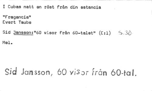//// 1 Cubas natt en röst från din estancia //// "Fragancia" //// Evert Taube //// Sid Jansson:"60 visor från 60-talet" (E:1) S.11() Mel. //// Sa d Jansson, 60 visor från 60-tal. ////