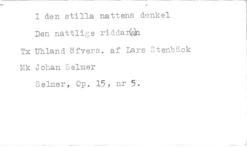 //// I den stilla nattens dunkel Den nattlige riddar(eil //// Tx Uhland öfvers. af Lars Etenbäck Mk Johan Selmer //// Selmer, Op. 15, nr 5. ////