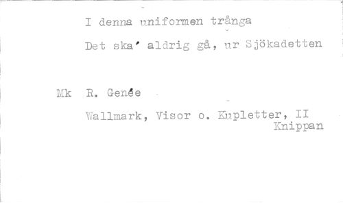 //// I denna uniformen trånga //// Det ska' aldrig gå, ur Sjökadetten //// Mk Genie //// Wallmärk, Visor o. Kupletter, II //// Knippan ////