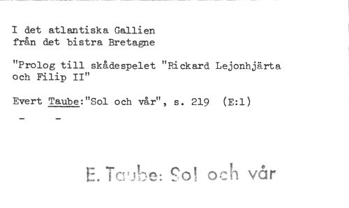 //// I det atlantiska Gallien //// från det bistra Bretagne //// "Prolog till skådespelet "Rickard Lejonhjärta och Filip II" //// Evert Taube:"Sol och vår", s. 219 (E:1) //// • ;be: °o! or.h vår ////