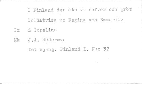 //// I Finland der åbo vi rofvor och ,,-röt Soldatvisa ur Regina von 7.3mmeritz //// Tx Z Topelius //// Mk J.A. Söderman //// Det sjung. Finland I. N:o 32 ////