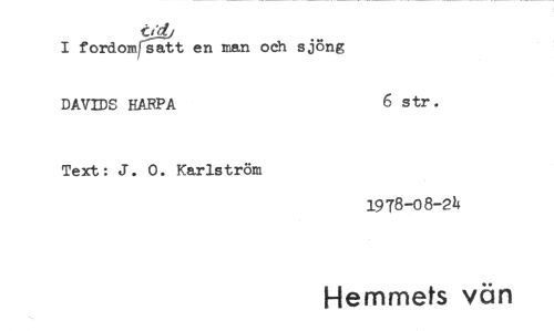 //// Mr) //// I fordom satt en man och sjöng //// DAVIDS HARPA 6 str. //// Text: J. 0. Karlström //// 1978-08-24 //// Hemmets vän ////