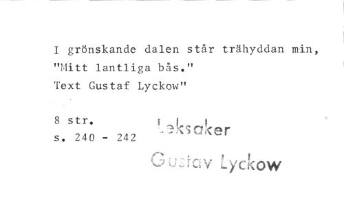 //// I grönskande dalen står trähyddan min, "Mitt lantliga bås." //// Text Gustaf Lyckow" //// 8 str. 1- ks aker //// s. 240 - 242 G cjcs Lyekow ////