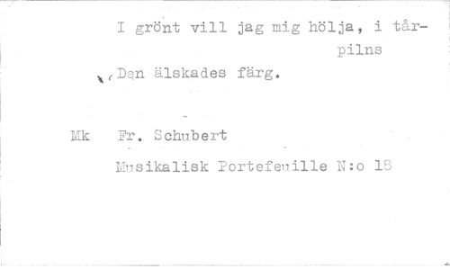 //// I grönt vill jag mig hölja, i tår- //// pilns //// x(3/9n älskades färg. //// Mk Fr. Schubert //// Musikalisk Portefenille N:o 18 //// y ////