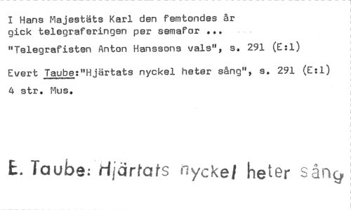 //// I Hans Majestäts Karl den femtondes år gick telegraferingen per semafor //// "Telegrafisten Anton Hanssons vals", s. 291 (E:1) Evert Taube:"Hjärtats nyckel heter sång", s. 291 (E:1) 4 str. Mus. //// E. Taube: Hjärtats nyckei heter sång ////