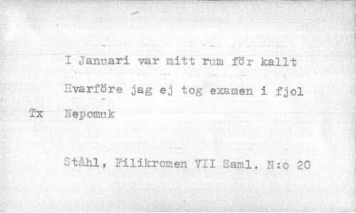 //// I Januari var mitt rum för kallt //// Hvarföre jag ej tog examen i fjol Tx Nepomuk //// Ståhl, Filikromen VII Saml. T T:o 20 ////