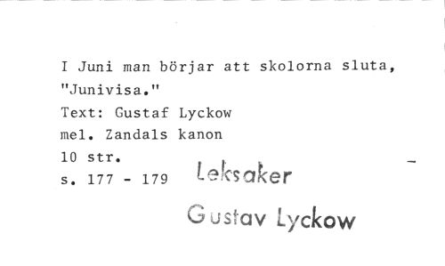//// I Juni man börjar att skolorna sluta, "Junivisa." //// Text: Gustaf Lyckow //// mel. Zandals kanon //// 10 str. //// s. 177 - 179 Leksaker //// G usi-av Lyckow ////