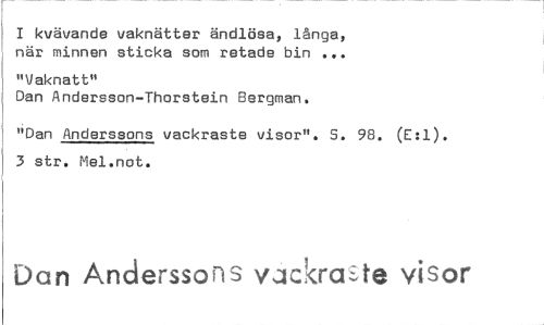 //// 1 kvävande vaknätter ändlösa, långa, //// när minnen sticka som retade bin ... //// "Vaknatt" //// Dan Andersson-Thorstein Bergman. //// "Dan Anderssons vackraste visor". B. 98. (E:1). 3 str. Mel.not. //// Dan Anderssons v4ckra:7-te visor ////