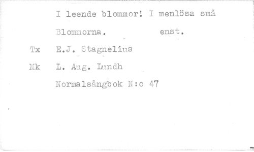 //// I leende blommor! I menlösa små Blommorna. enst. //// Tx E.J. Stagnelius //// Lik L. Aug. Lundh //// Normalsångbok N:0 47 ////