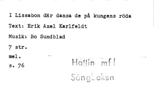 //// 1 Lissabon där dansa de på kungens röda Text: Erik Axel Karlfeldt //// Musik: Bo Sundblad //// 7 str. mel. //// s. 76 Ha lin mf //// Scling:_oken ////