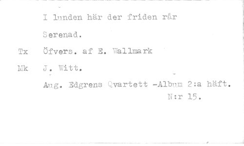 //// I lunden här der friden rår Serenad. //// Tx öfvers. af E. Walimark Lik J. Witt. //// Aug. Edgrens Qvartett -Album 2:a käft. //// N•r 15. ////
