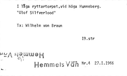 //// I låga ryttartorpet,vid höga Hunneberg. "Olof Silfverlood" //// Tx: Wilhelm von Braun //// I9.str //// * 4 atä (21 E) //// 1^• //// CY //// 1-4 e fr) nn e ts Nr.4 27.1.1966 ////