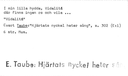 //// I min lilla hydda, Vidalitå där finns ingen ro och vila ... //// "Vidalitå" //// Evert Taube:"Hjärtats nyckel heter sång", s. 302 (E:1) 6 str. Mus. //// E. Taube: Hjärtats nyckel hete //// c ////