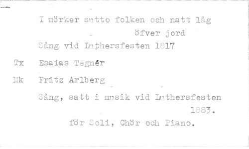 //// I mörker sutto folken och natt låg //// öfver jord //// Sång vid Luthersfesten 1817 //// Tx Esaias Tegn4r //// ijk Fritz Arlberg //// Sång, satt i musik vid Luthersfesten //// 1883. för Soli Chör och Piano. ////