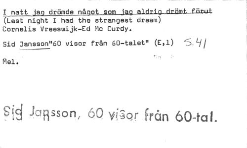 //// I natt a. drömde nå ot so (Last night I had the strangest dream Cornelis Vreeswijk-Ed Mc Curdy. //// Sid Jansson"60 visor från 60-talet" (E,1) Mel. //// gg:d JaHsson, 60 visor från 60-tal. ////