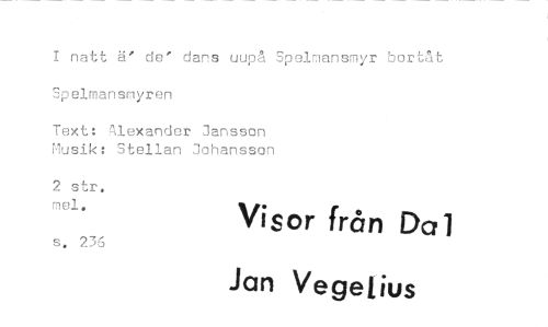//// I natt ä' de' dans uupå Spelmansmyr bortåt Spelmansmyren //// Text: Alexander Jansson Musik: Stellan Johansson //// 2 str. mal. Visor från Dal //// s. 236 Jan Vegelius ////