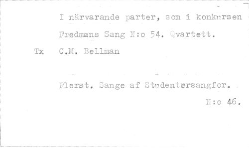 //// I närvarande parter, som i konkursen //// Fredmans Sang N:o 54. '2vartett. Tx C.M. Bellman //// Flerst. Sange- af Studentersangfor. //// E:o 46. ////