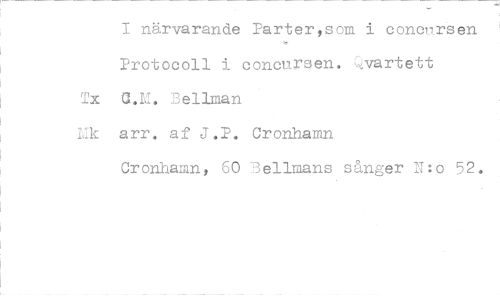 //// I närvarande Parter som i cononrsen //// Protocoll i concursen. .,vartett Tx a. Ds. Bellman //// Lk arr. af J.P. Cronhamn //// Cronhamn, 60 Bellmans sånger N:o 52. ////