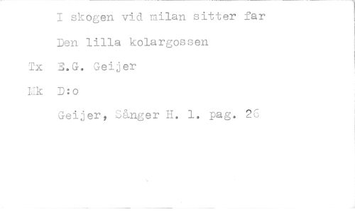 //// 1 skogen vid milan sitter far Den lilla kolargossen //// Tx E.G. Geijer //// Mk D:o //// Geijer, Sånger H. 1. pag. 26 ////