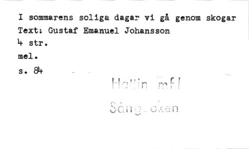 //// I sommarens soliga dagar vi gå genom skogar Text: Gustaf Emanuel Johansson //// 4 str. //// mel. //// s. 84 //// y • r //// 3G Å en ////