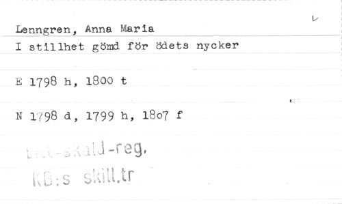 //// Lenngren, Anna Maria //// 1 stillhet gömd för ödets nycker //// E 1798 h, 1800 t //// N 1798 d, 1799 h, 18o7 f //// 1-reg, //// ;;Ai'd,tr //// t //// /