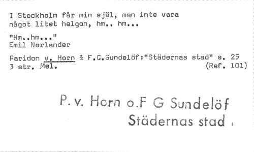 //// I Stockholm får min själ, man inte vara något litet helgon, hm.. hm... //// "Hm..hm..." Emil Norlander //// Paridon v. Horn & F.G.Sundelöf:"Städernas stad" s. 25 //// 3 str. Mel. (Ref. 101) //// P. v. Hcrn o.F G Sundelöf //// Städernas stad ////