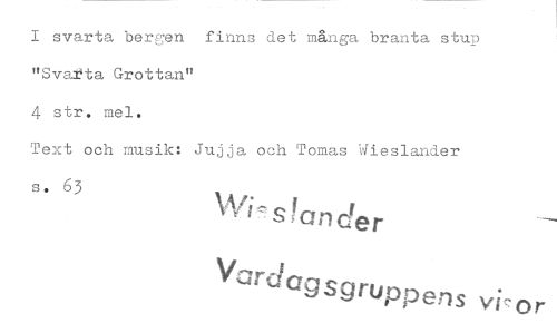 //// I svarta bergen finns det många branta stup "Svarta Grottan" //// 4 str. mel. //// Text och musik: Jujja och Tamas Wieslander //// s. 63 \\.7 s fonder //// Vardagsgruppens vi-or ////