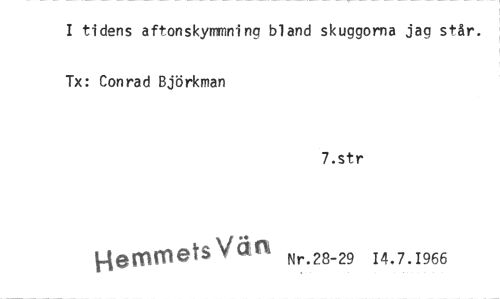 //// I tidens aftonskymmnino bland skuggorna jaa står. Tx: Conrad Björkman //// 7.str //// Hemmets Va Nr.28-29 14.7.1966 ////