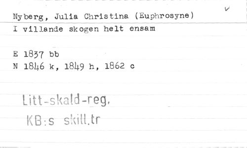 //// Nyberg, Julia Christina (Euphrosyne) 1 villande skogen helt ensam //// E 1837 bb //// N 1846 k, 1849 h, 1862 c //// Lift-skald-reg, //// KB:s tr ////
