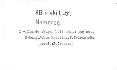 //// KB:s skilt.-f. //// Namnreg. //// I villande skogen helt ensam jag satt Nyberg,Julia Kristina,f.Svärdström (pseud.:Eufrosyne) ////