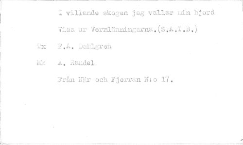//// I villande skogen jag vallar 2in hjord Visa ur Verrlänningarna.(S.A.T.B.) //// x F.A. LaDlren //// A. Aandel //// Från Nix och 2jerran No 17. ////