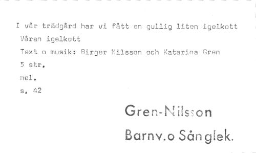 //// I vår trädgård har vi fått en gullig liten igelkott Våren igelkott //// Text o musik: Birger Nilsson och Katarina Gren 5 str. //// mel. //// s. 42 //// Grep:-I,, ils on //// Barnv.o Sånglek. ////