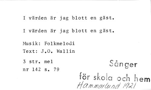 //// I värden är jag blott en gäst. //// I värden är jag blott en gäst. //// Musik: Folkmelodi //// Text: J.O. Wallin //// 3 str. mel nr 142 s. 79 ger //// för skog och hem //// /-04742ar&I4d /92 //// /