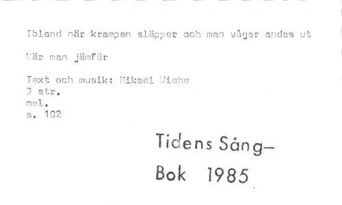//// Ibland när krampen släpper och man vågar andas ut När man jämför //// Text och musik: Mikael 'dich° 3 str. //// mel. //// s, 102 //// Tidens Sån g— //// Bok 1985 ////