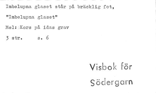 //// Imbelupna glaset står på bräcklig fot, "Imbelupna glaset" //// Mel: Kors på idas grav //// 3 str. s. 6 //// Visbok för //// Södergarn ////