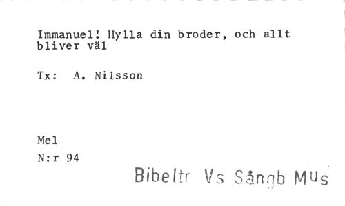 //// Immanuel! Hylla din broder, och allt bliver väl //// Tx: A. Nilsson //// Mel //// N:r 94 //// Bibeltr s Sånrib Mus ////