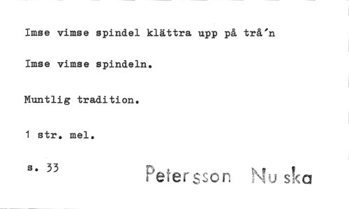 //// Imse vimse spindel klättra upp på trå'n Imse vimse spindeln. //// Muntlig tradition. //// 1 str. mel. s. 33 //// efers:,on "\ I //// 'J s a ////