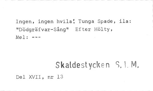 //// Ingen, ingen hvila: Tunga Spade, ila: "Dödgräfvar-Sång" Efter Hölty, //// Mel: //// Skaldestycke n S, 1. M, //// Del XVII, nr 13 ////